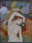 Olie op doek is de basis van deze categorie , een samenspel van kleurrijke vlakken en cirkels en een figuur.